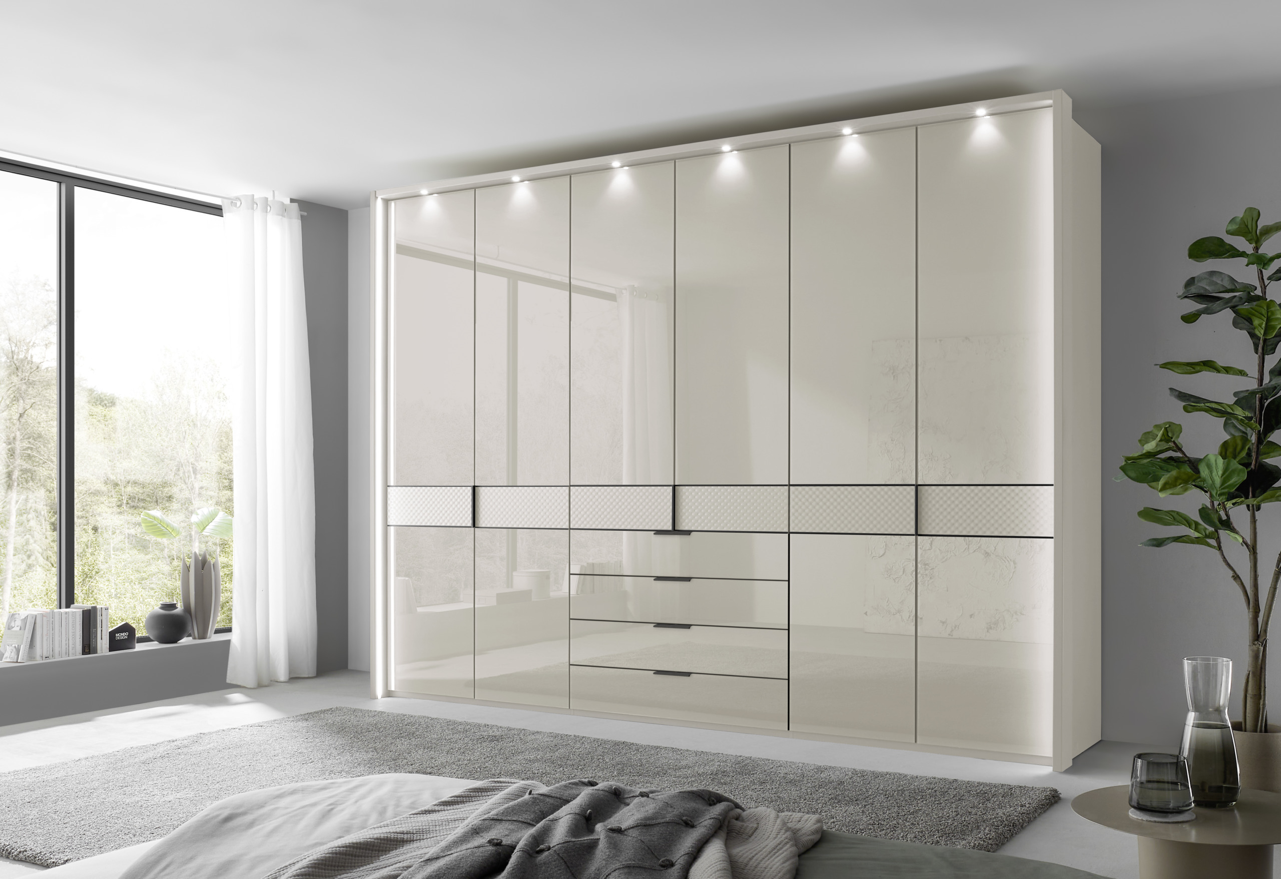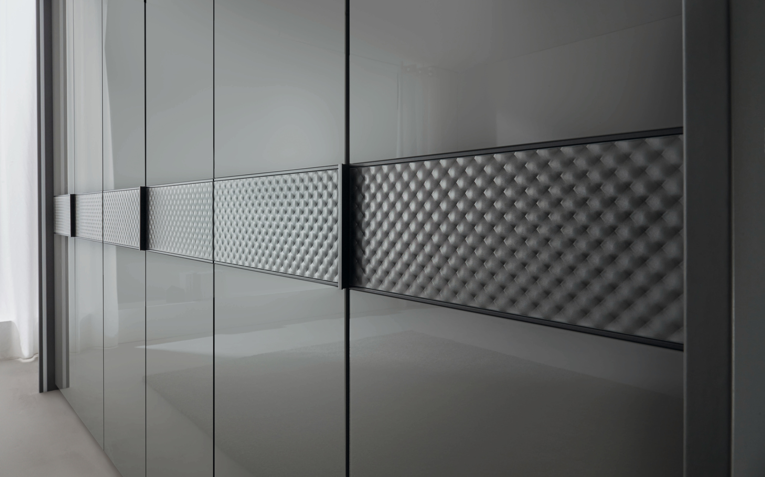 Texture is the outstanding feature of this hinged door collection – with its central horizontal panel of diamond-shaped ripple glass. Striking in moody lava or soothing in soft champagne (both with glass or matt options for fronts), Ambiero’s comprehensive full length or combi-drawer options provide ample variations.