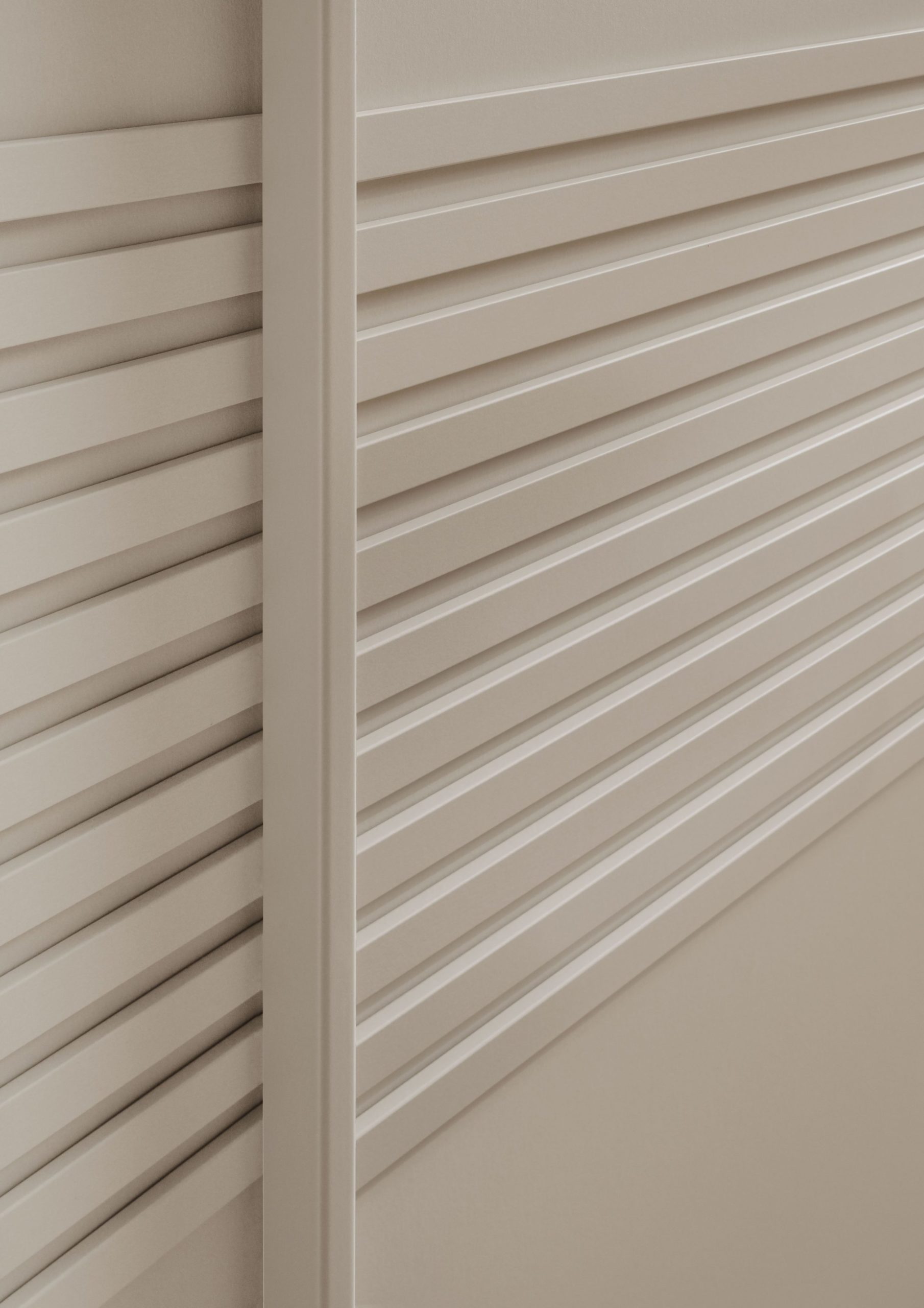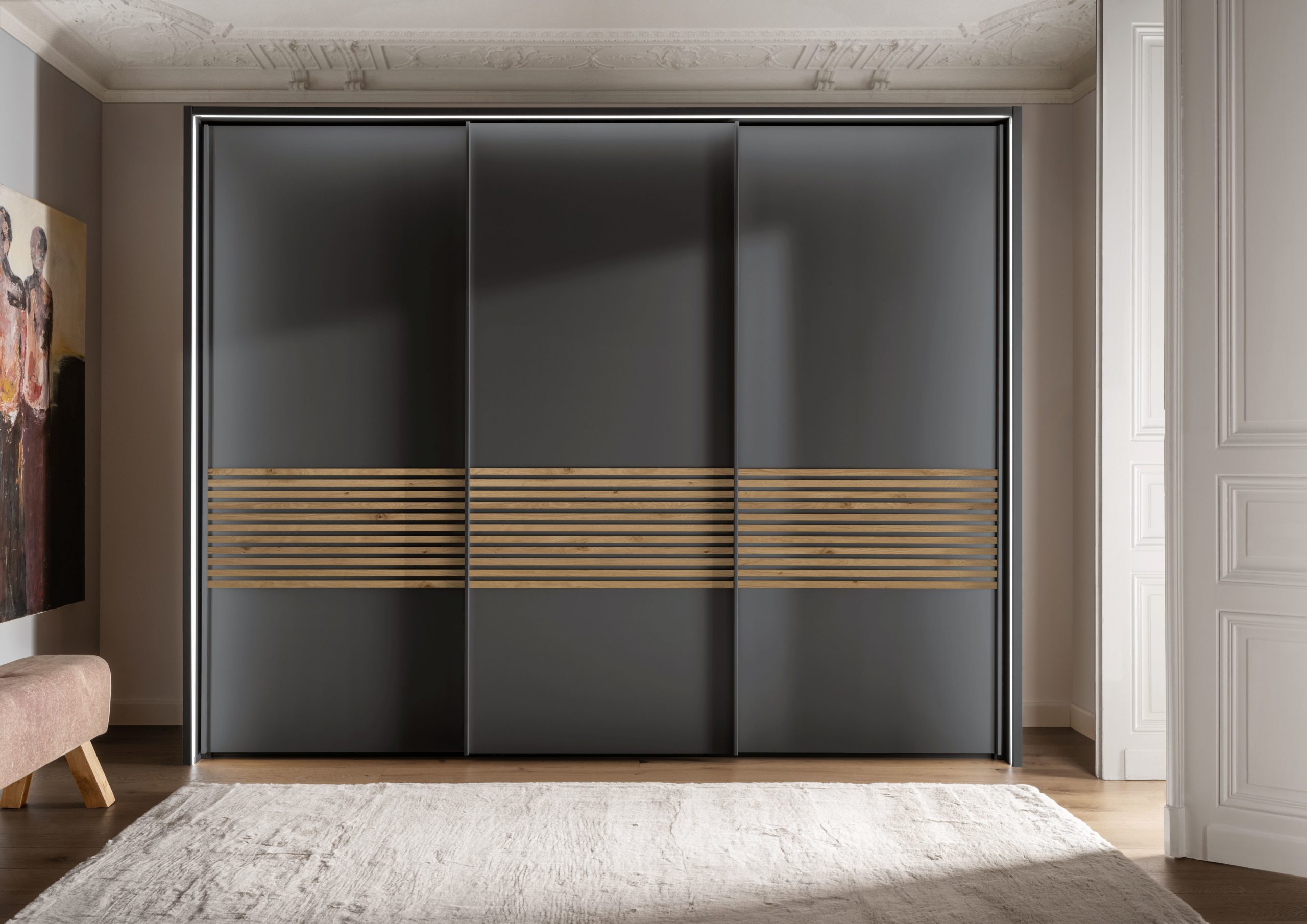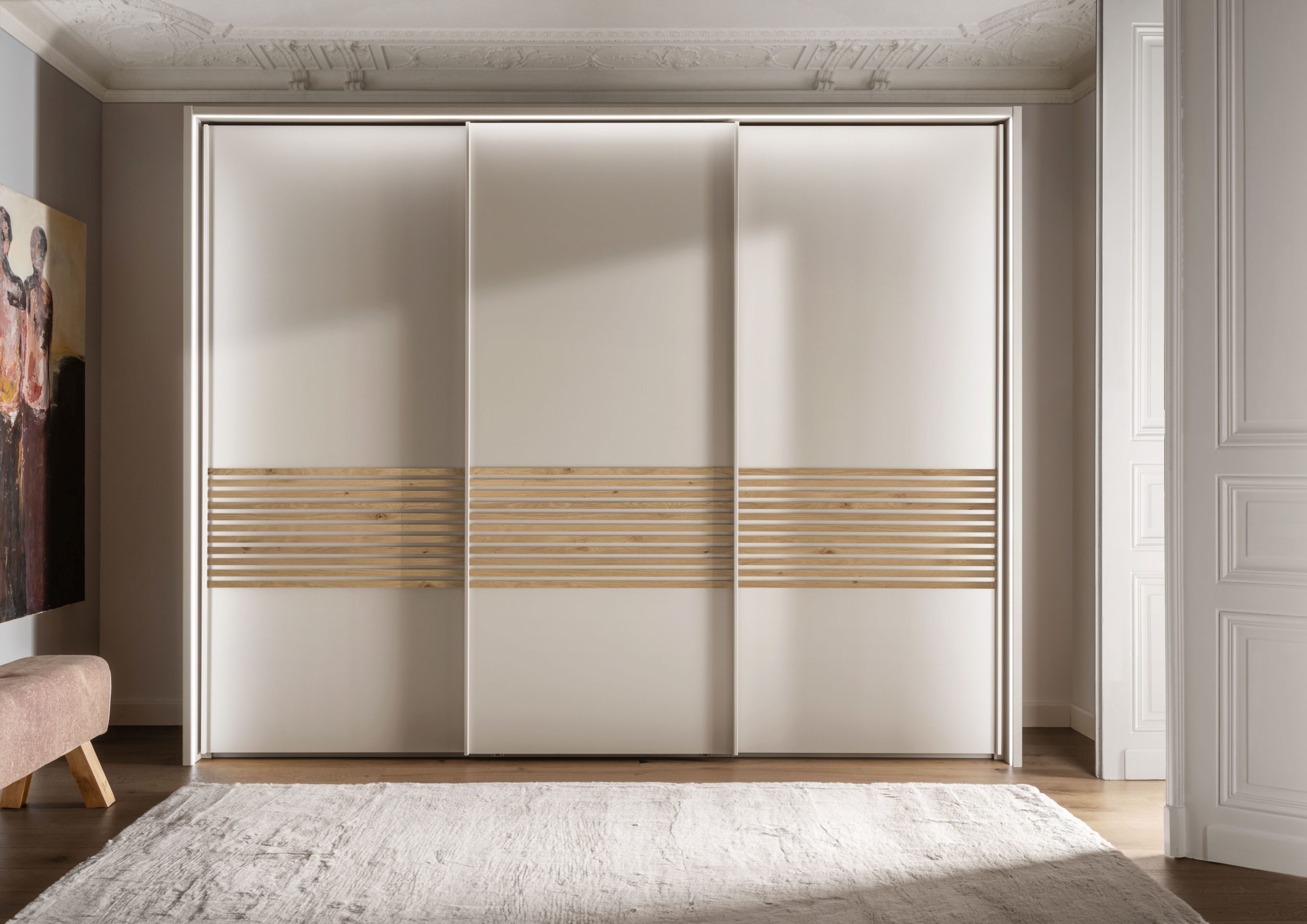 Fresh and modern in a choice of white, champagne, pebble grey, graphite, or Bianco oak, Lugano is a versatile sliding door collection featuring a striking self-coloured or contrasting decking style cross trim, subtly enhanced by Wiemann’s clever lighting options and a neat slate handle.