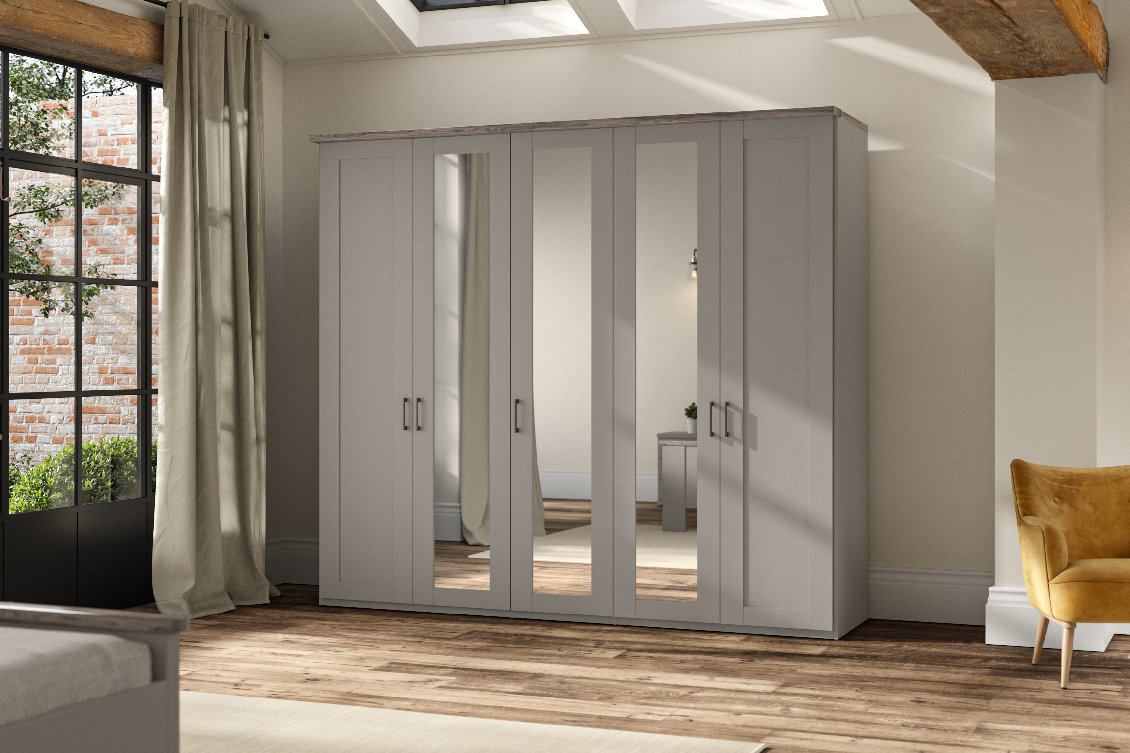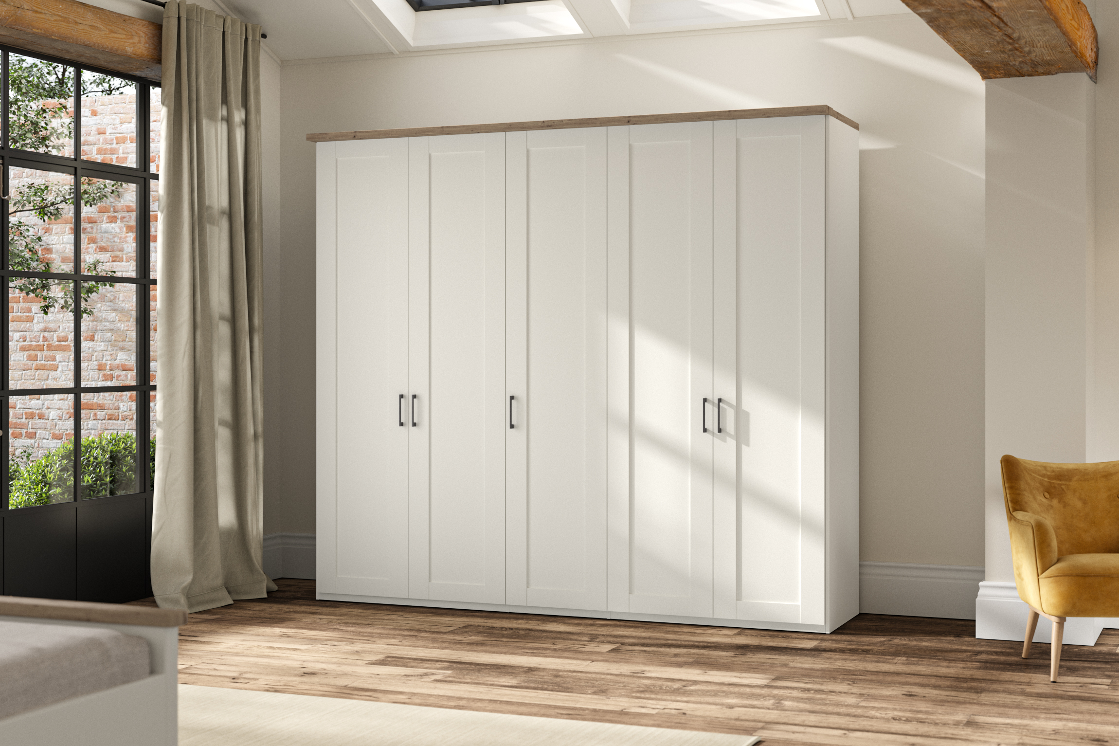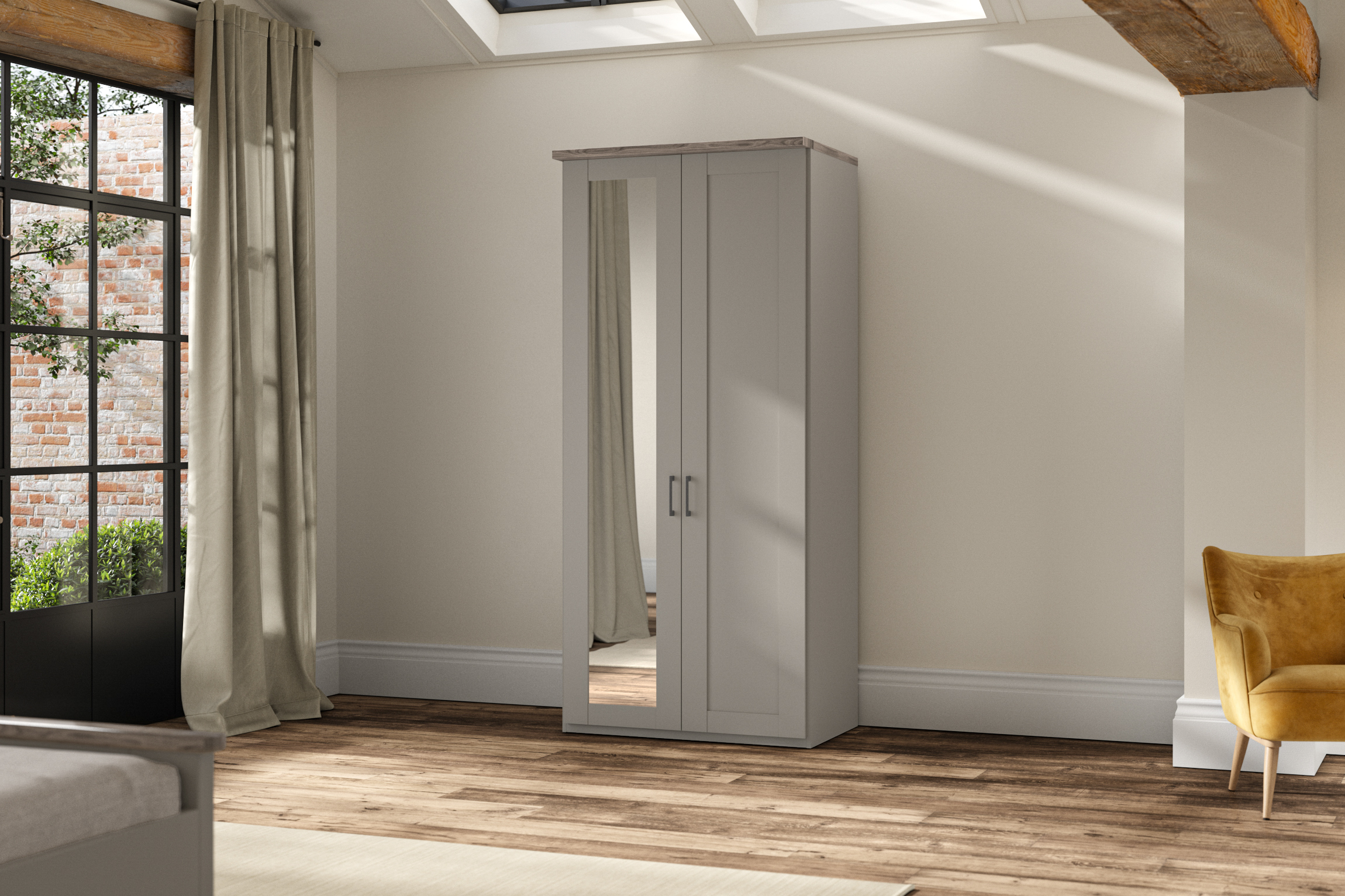 Appealing to those who prefer a slightly more country cottage style, Truro is also a great value for money option. Hinged robes, matching bed and storage chests are offered in white or sage green with a Bianco oak cornice; or pebble grey with a dark rustic oak one.